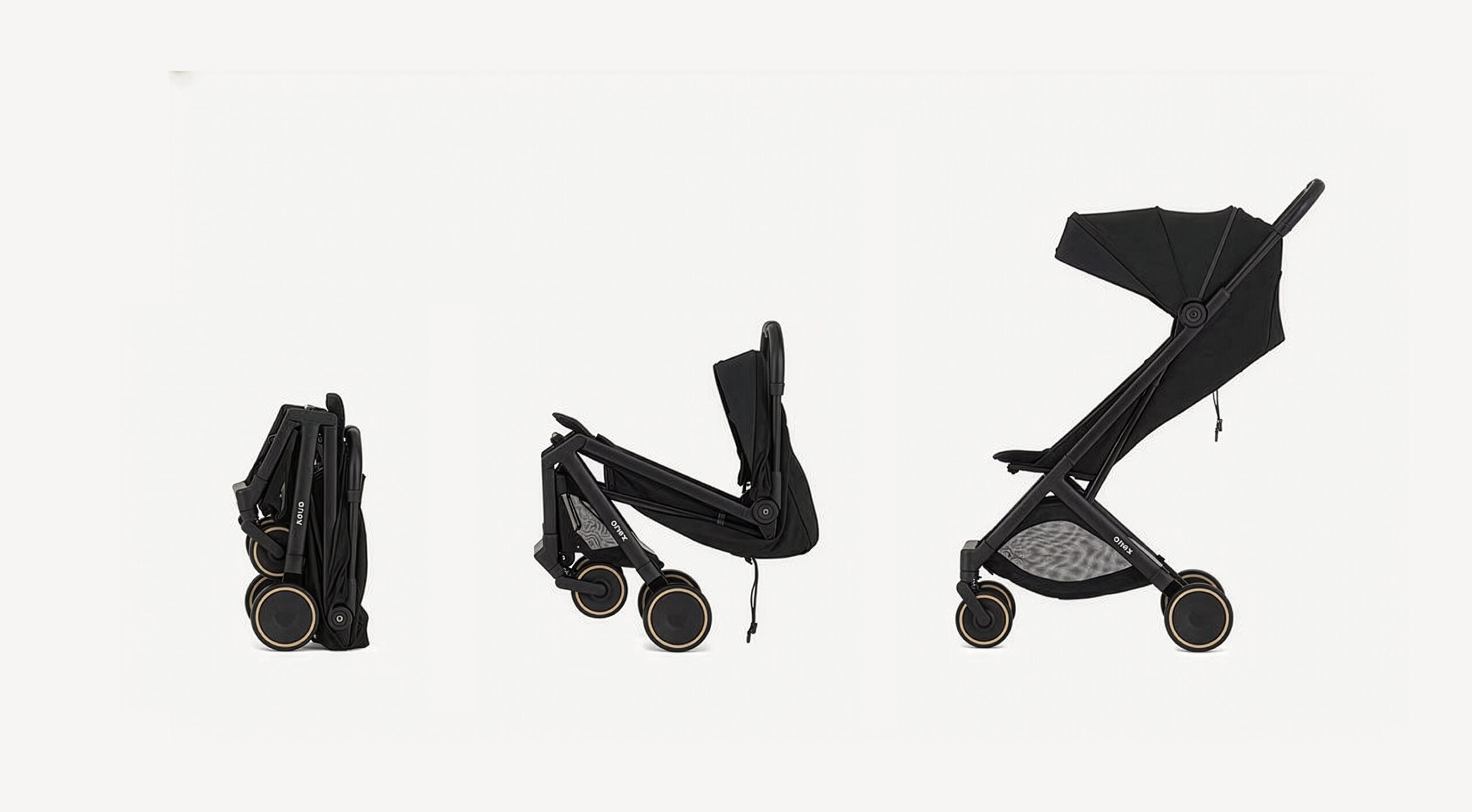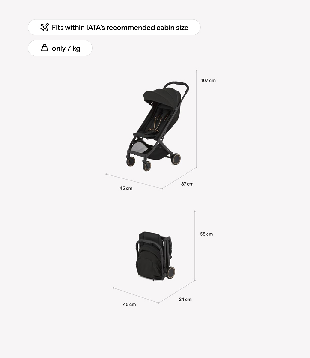 Air-X² is a compact stroller designed for mobility and effortless travel. Its folded dimensions (55 × 45 × 24 cm) allow it to fit into an airplane overhead compartment, making it a practical solution for active families. The structure enables quick one-handed folding, and once folded, the stroller stands upright on its own, making storage and transport easier.