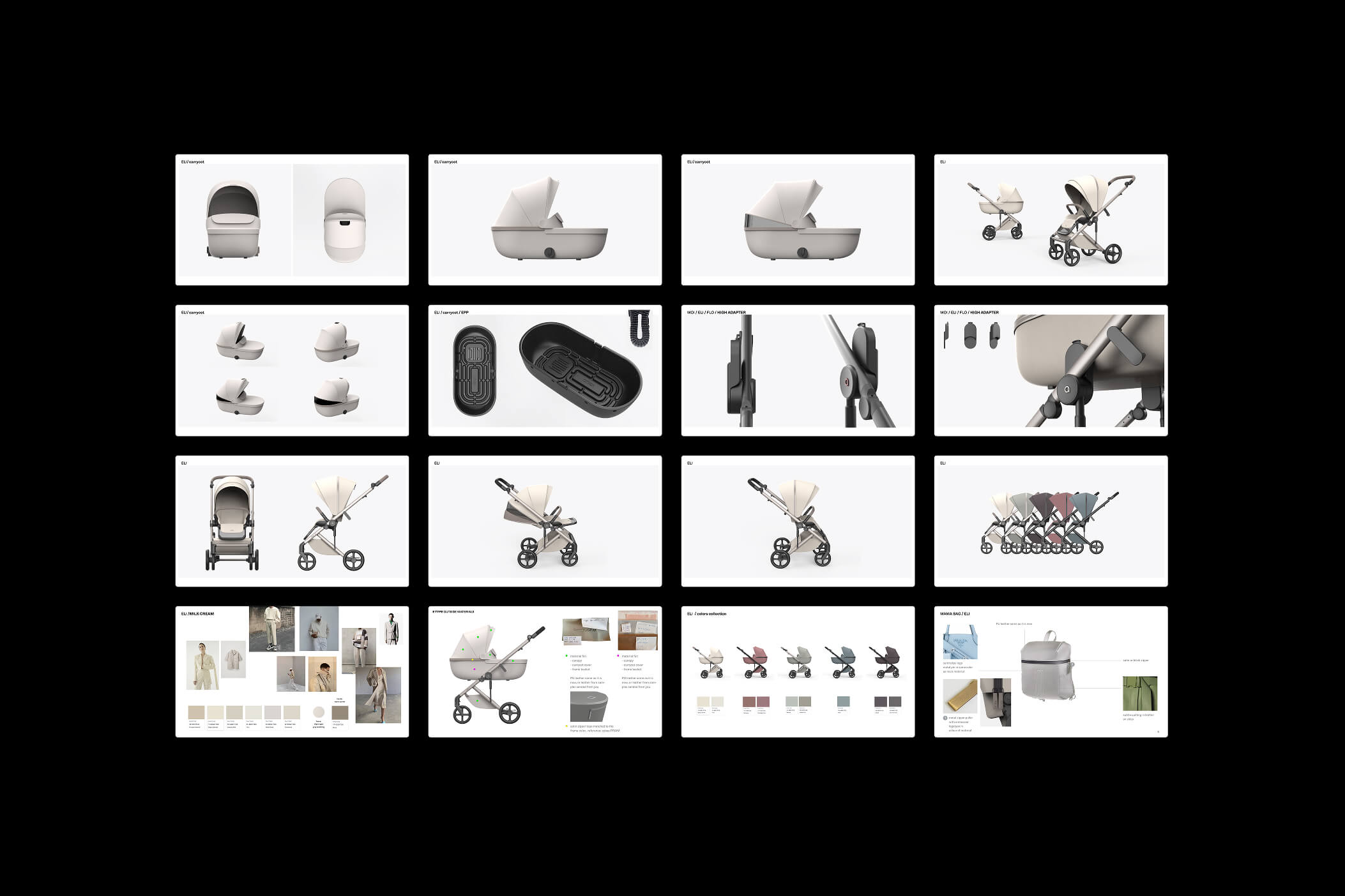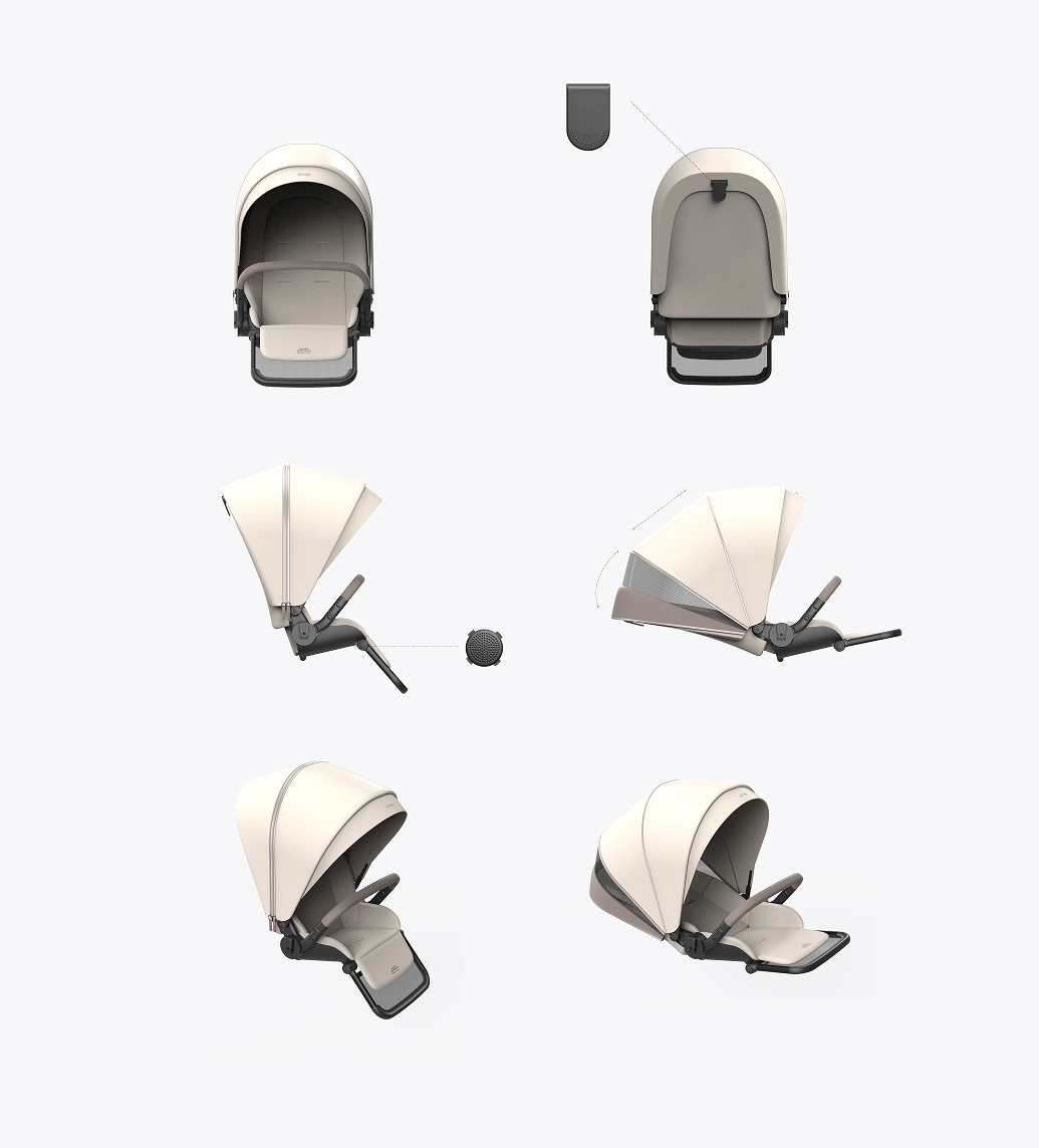 The project scope included comprehensive design development of all stroller components — including the frame, seat unit, carrycot, and upholstery — as well as material, finish, and color selection (CMF), branding implementation, and accessory design.