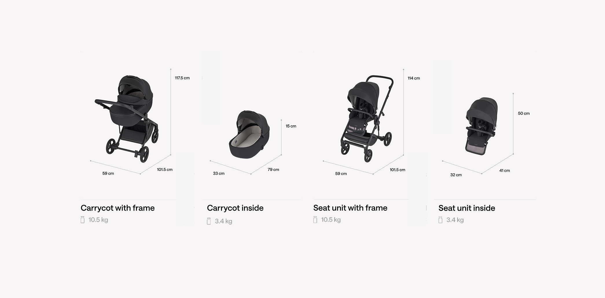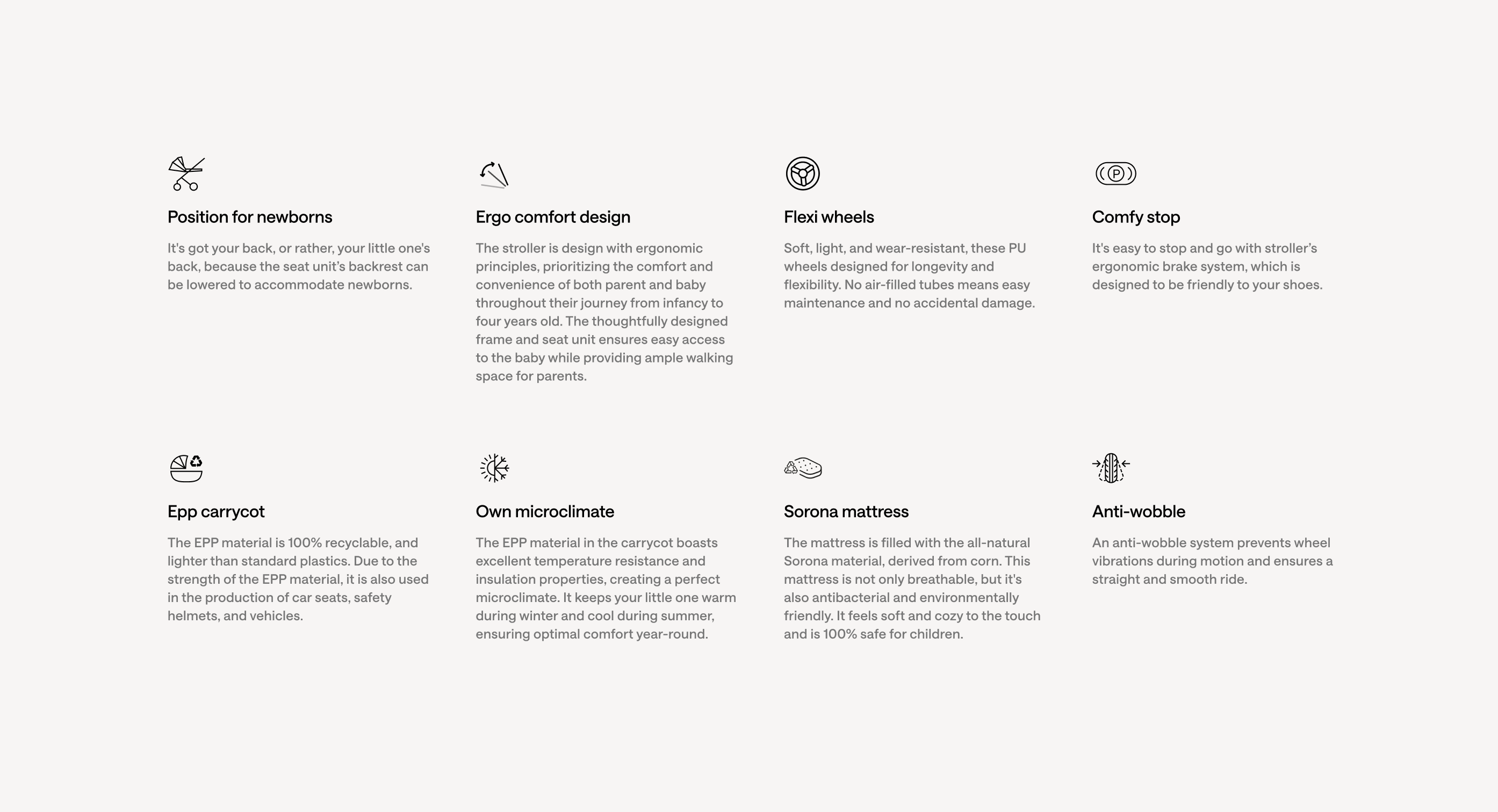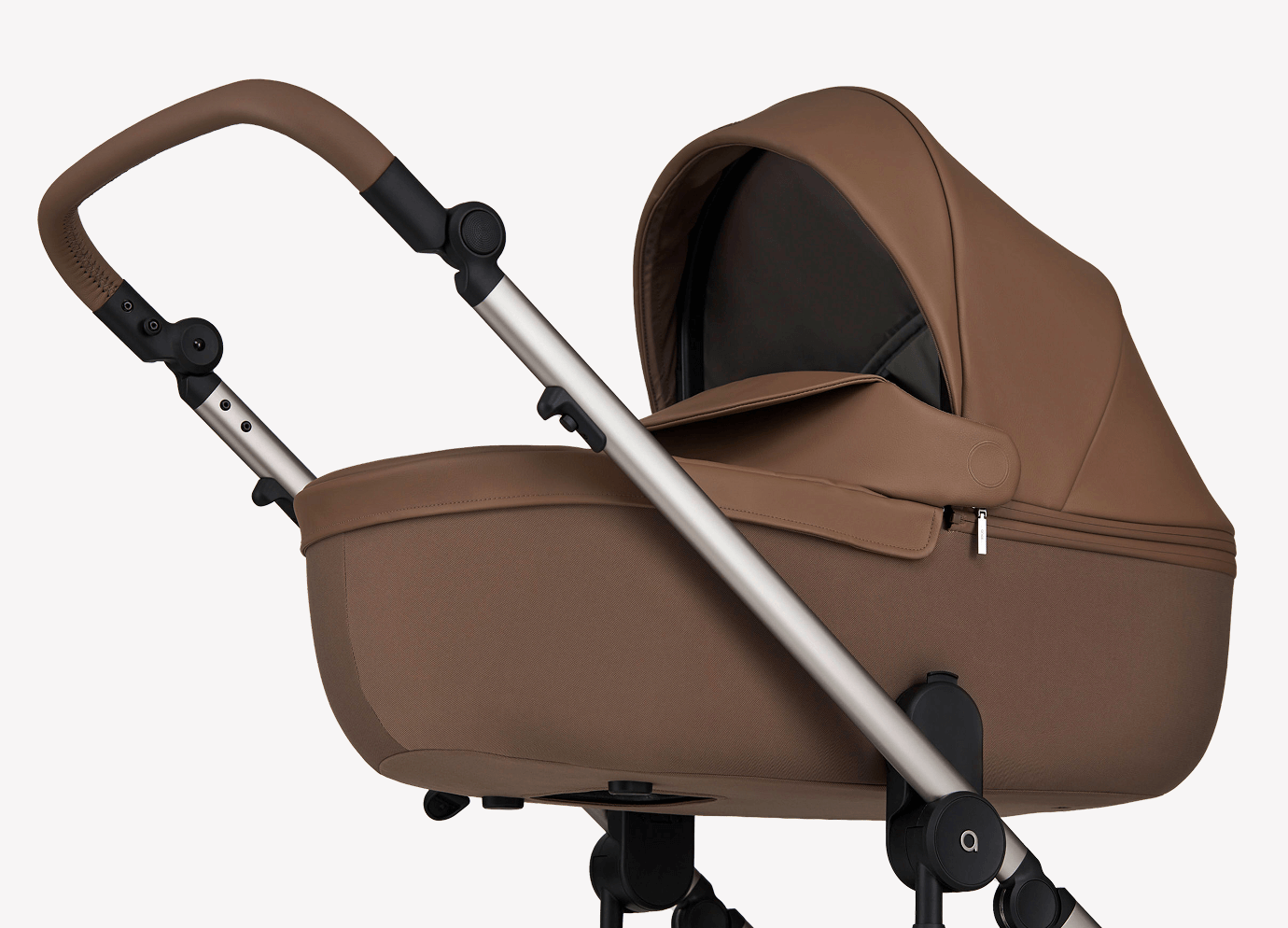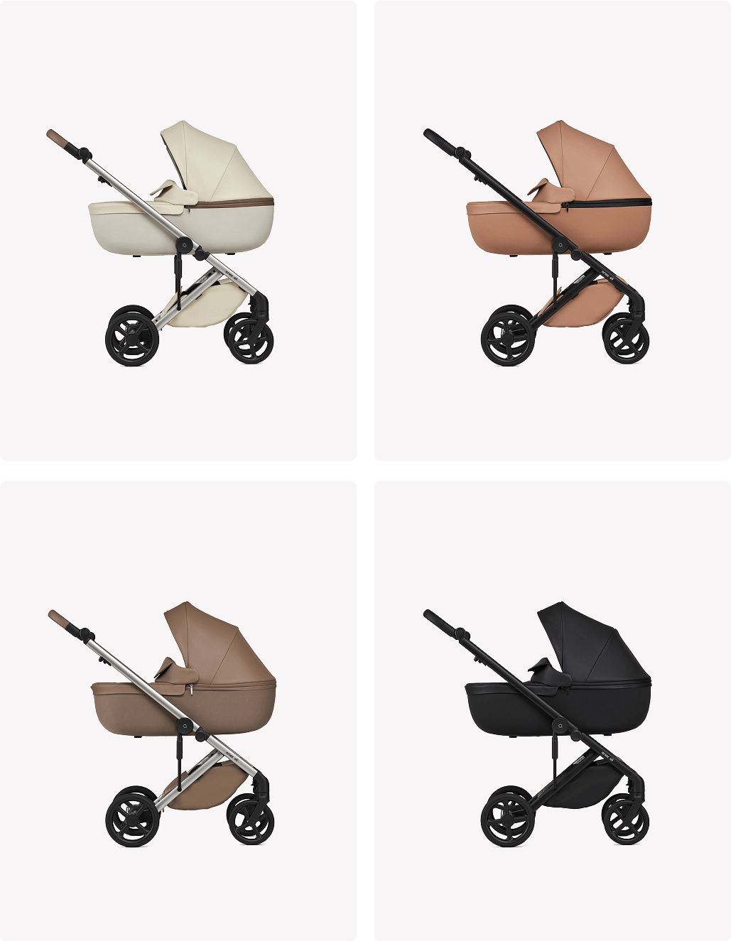 The carrycot is very lightweight thanks to the use of EPP material, and its height can be adjusted using adapters, improving usability and facilitating closer interaction between parent and child. Memory buttons allow the carrycot and seat unit to be detached with one hand. Lightweight wheels with a closed profile are easy to keep clean, while the suspension system ensures comfortable use across various types of terrain.