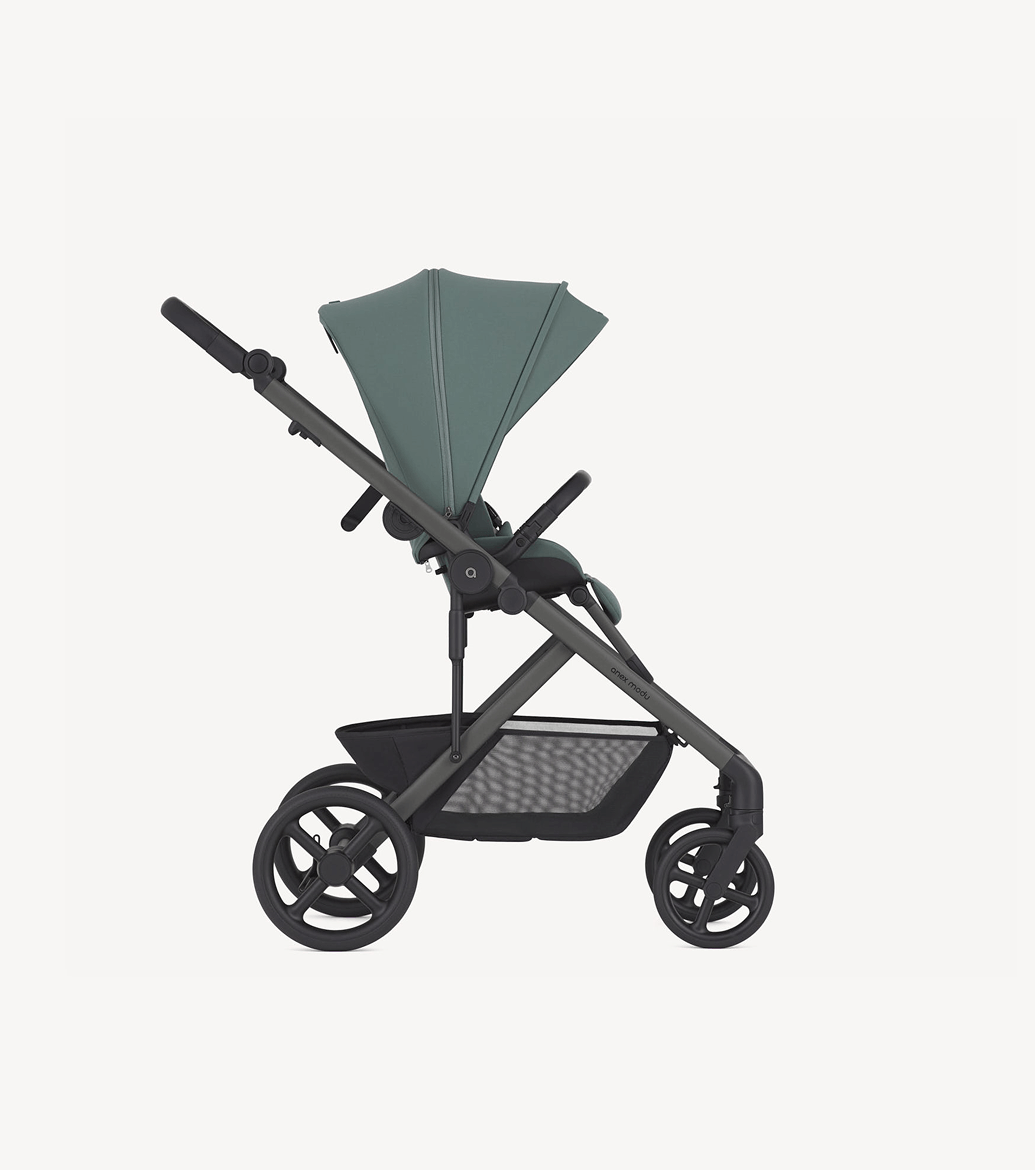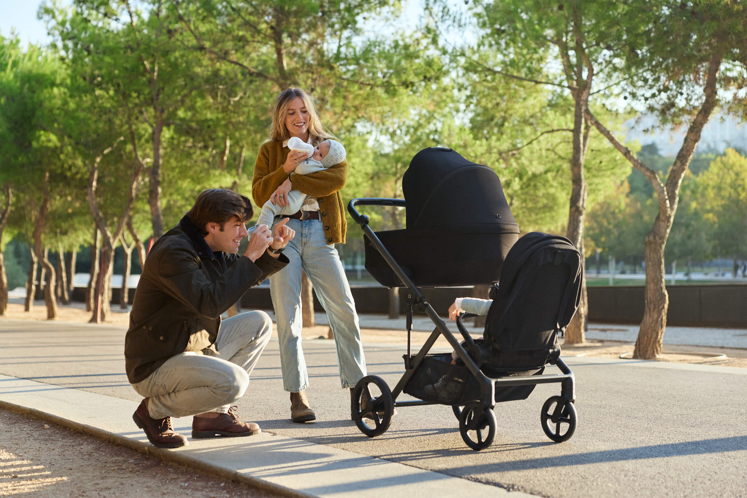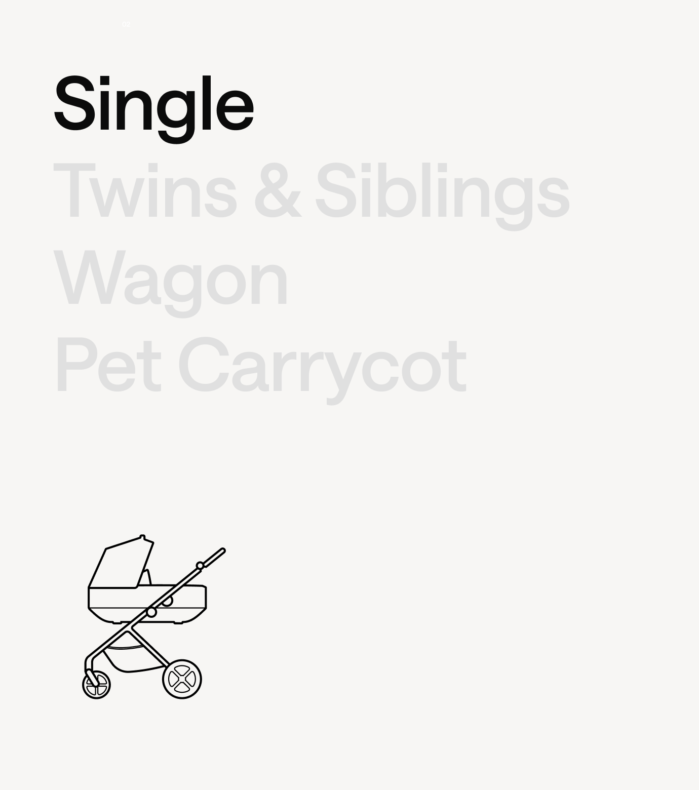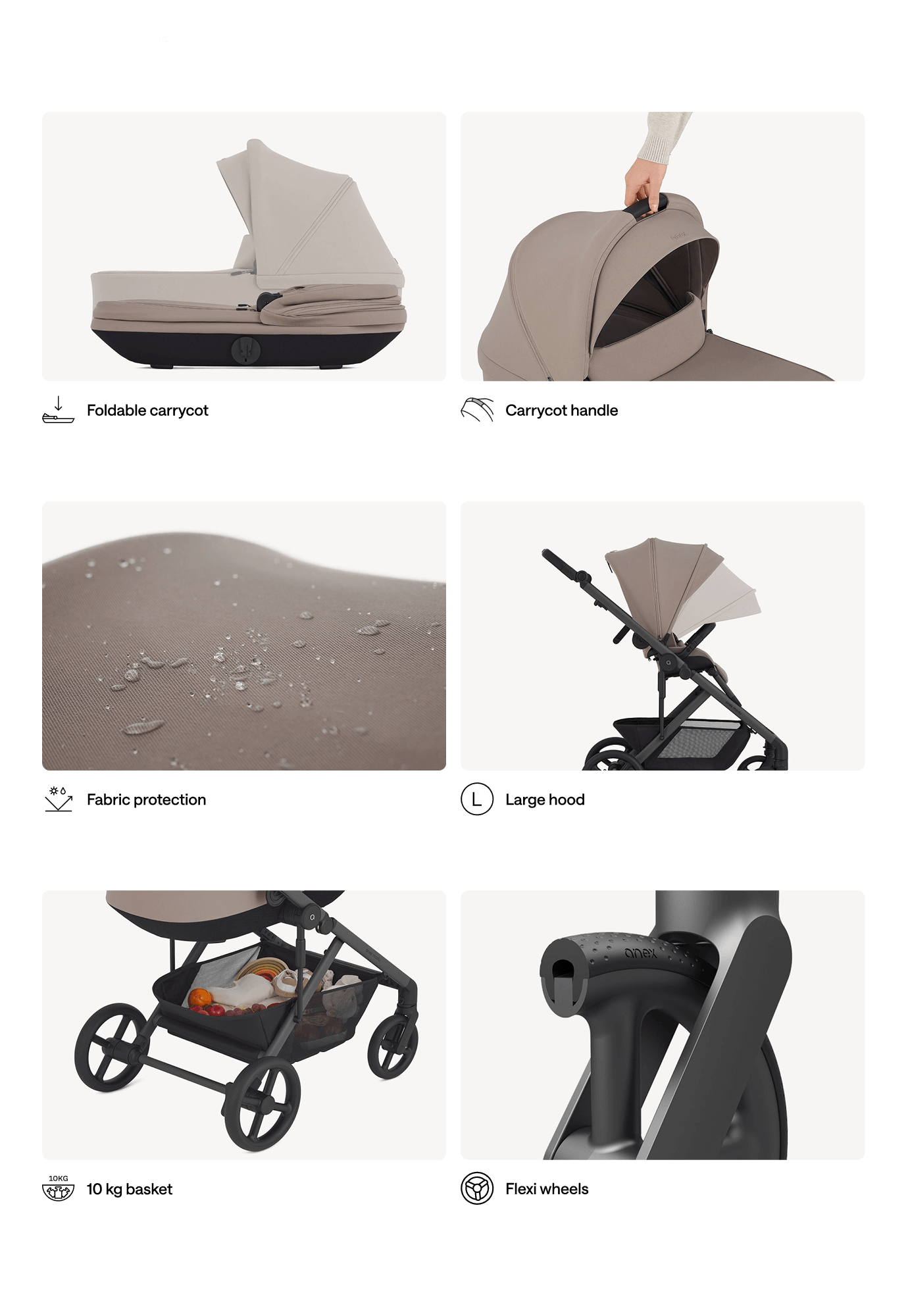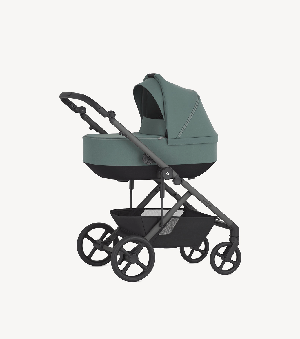 The newly designed carrycot features a distinctive geometry that increases the field of view for the second passenger. Both the carrycot and the frame — across different configurations — are foldable, making transport and storage significantly easier.