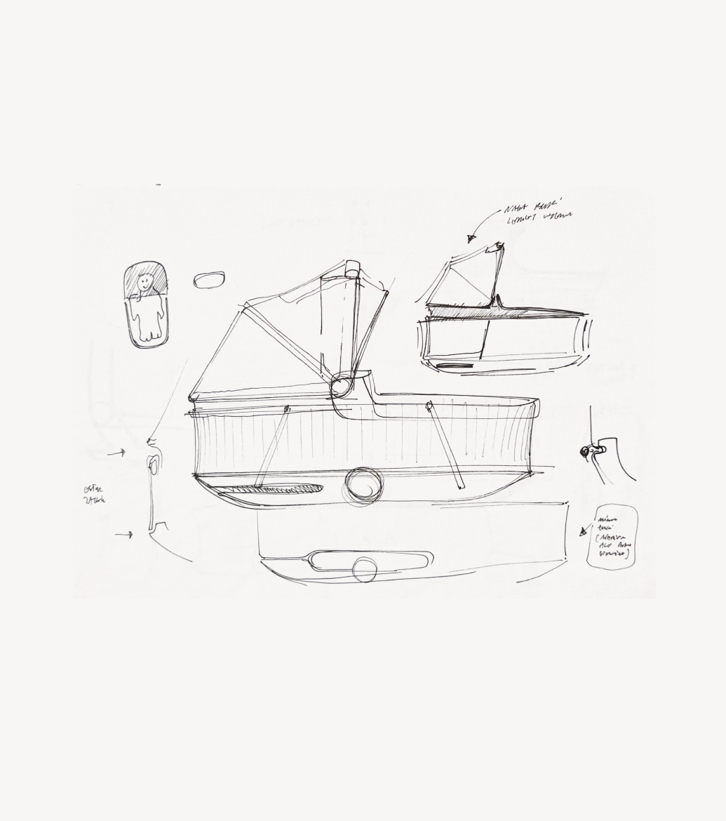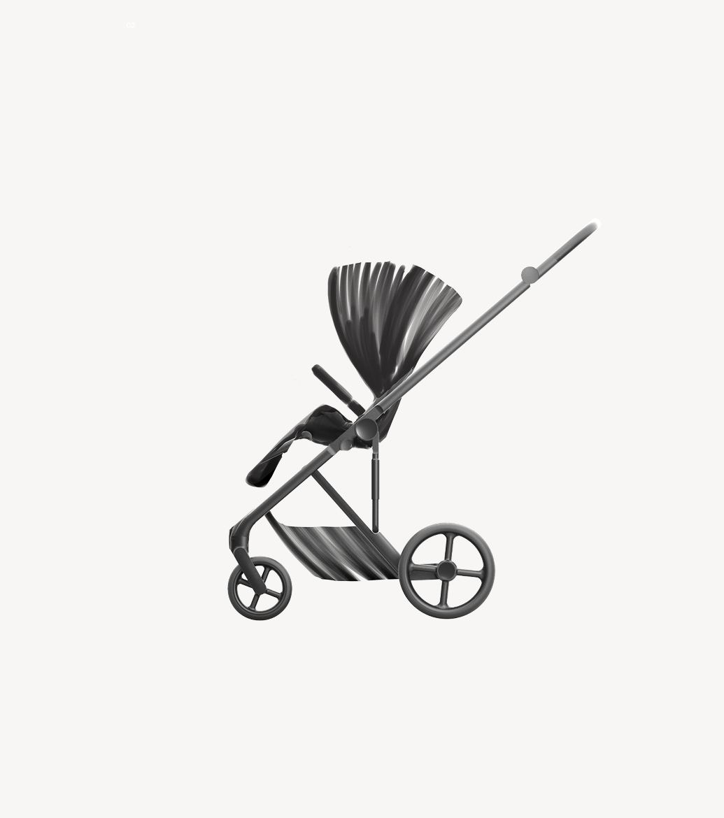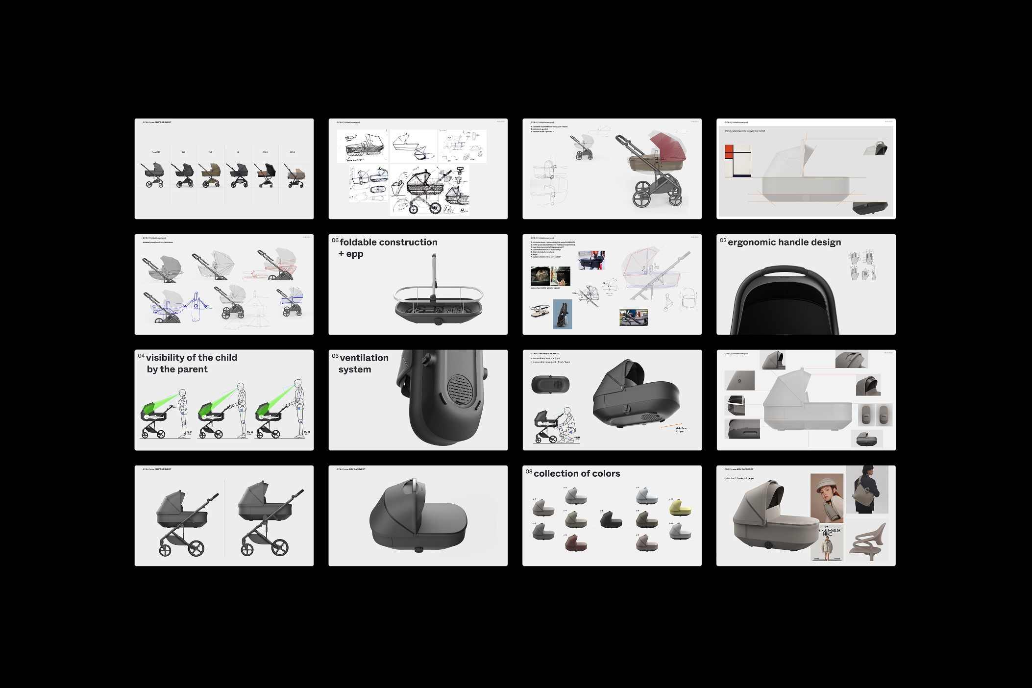 The project scope included ergonomic analysis of all configurations, comprehensive product design development — including the frame, carrycot, seat, and wagon module — as well as material and finish selection (CMF) and branding implementation.