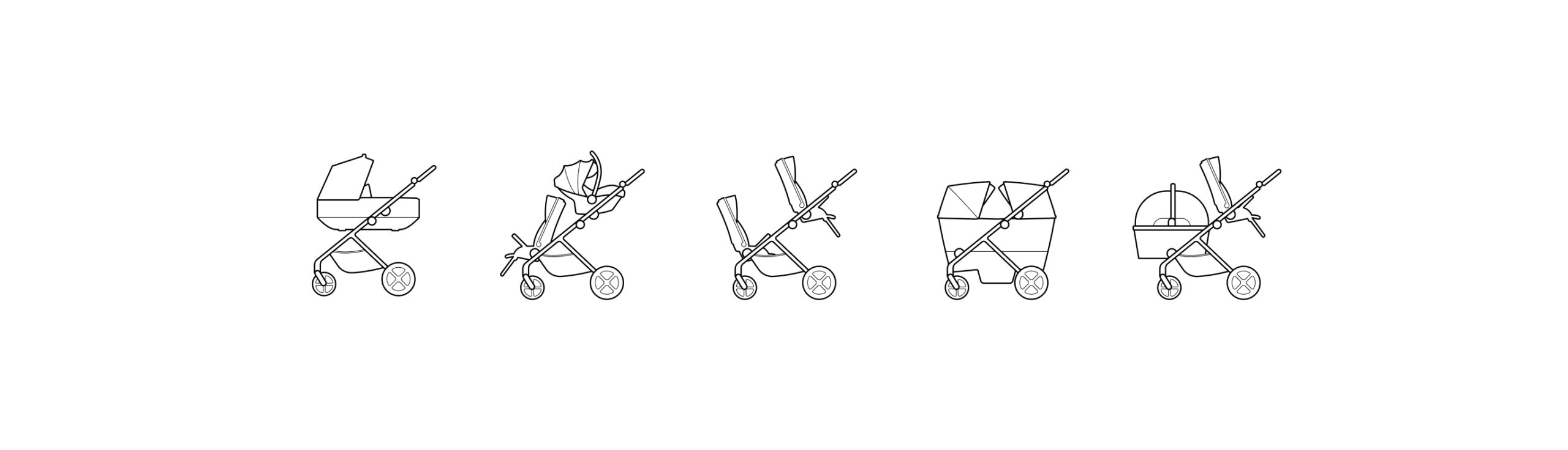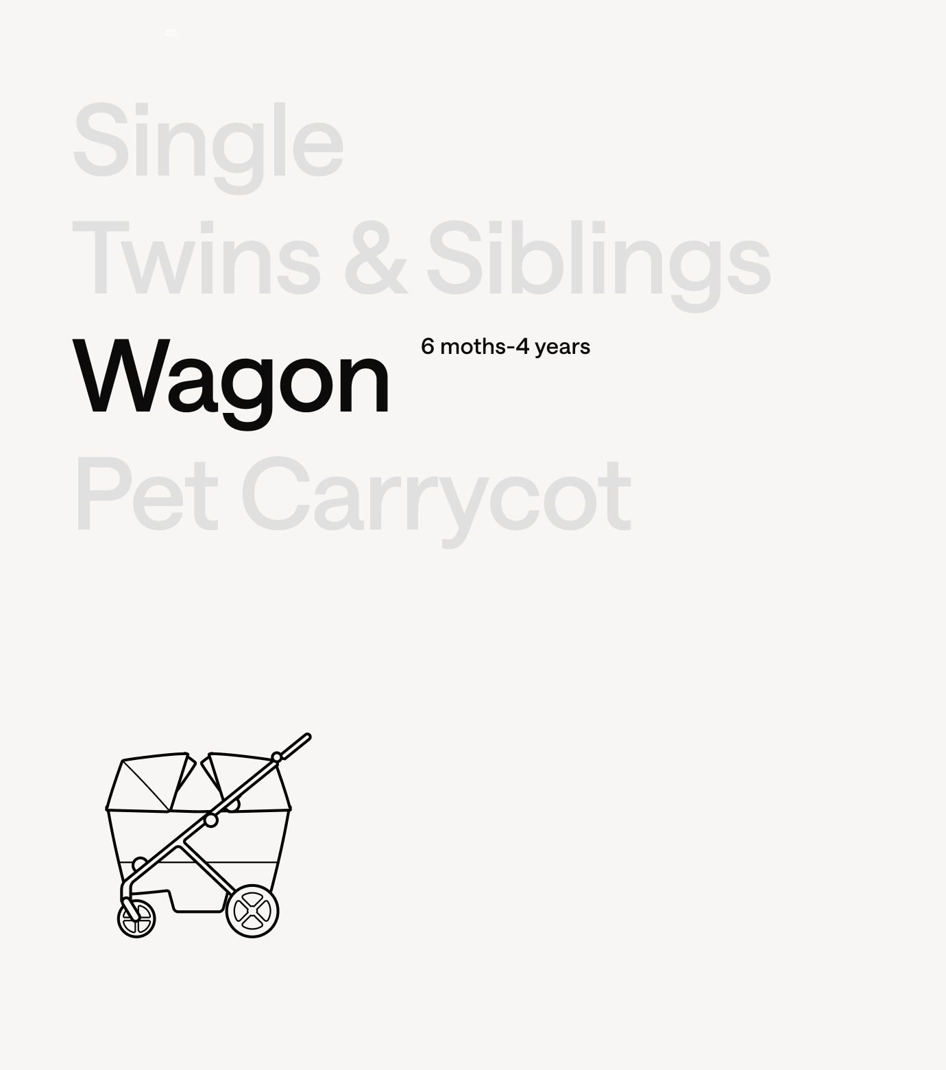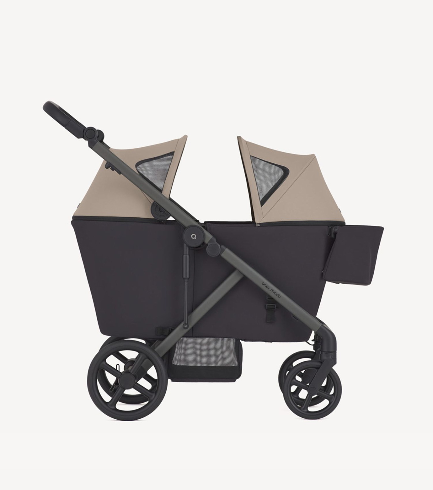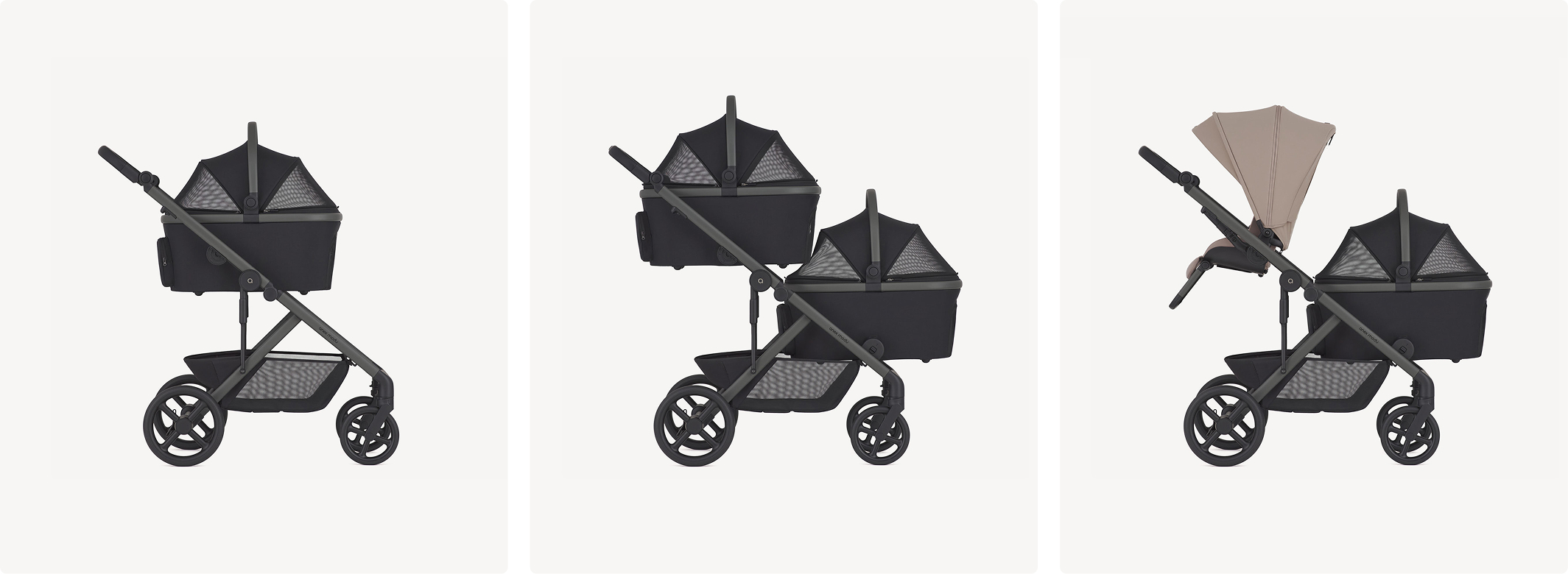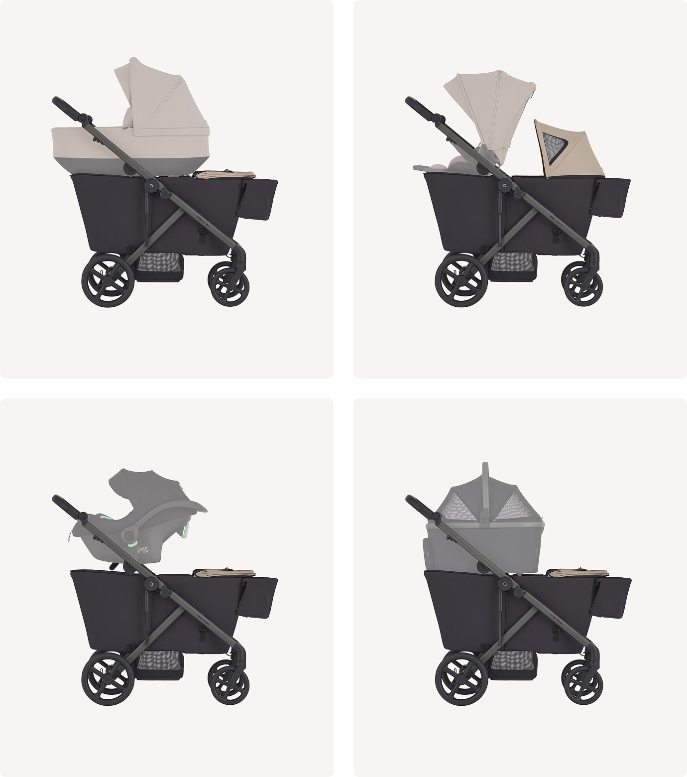 Various configurations can be freely mounted on the frame, including two carrycots for infants, a carrycot and a seat, two seats, or one of them combined with a pet carrier. In wagon mode, it can comfortably accommodate two children up to 4 years old.