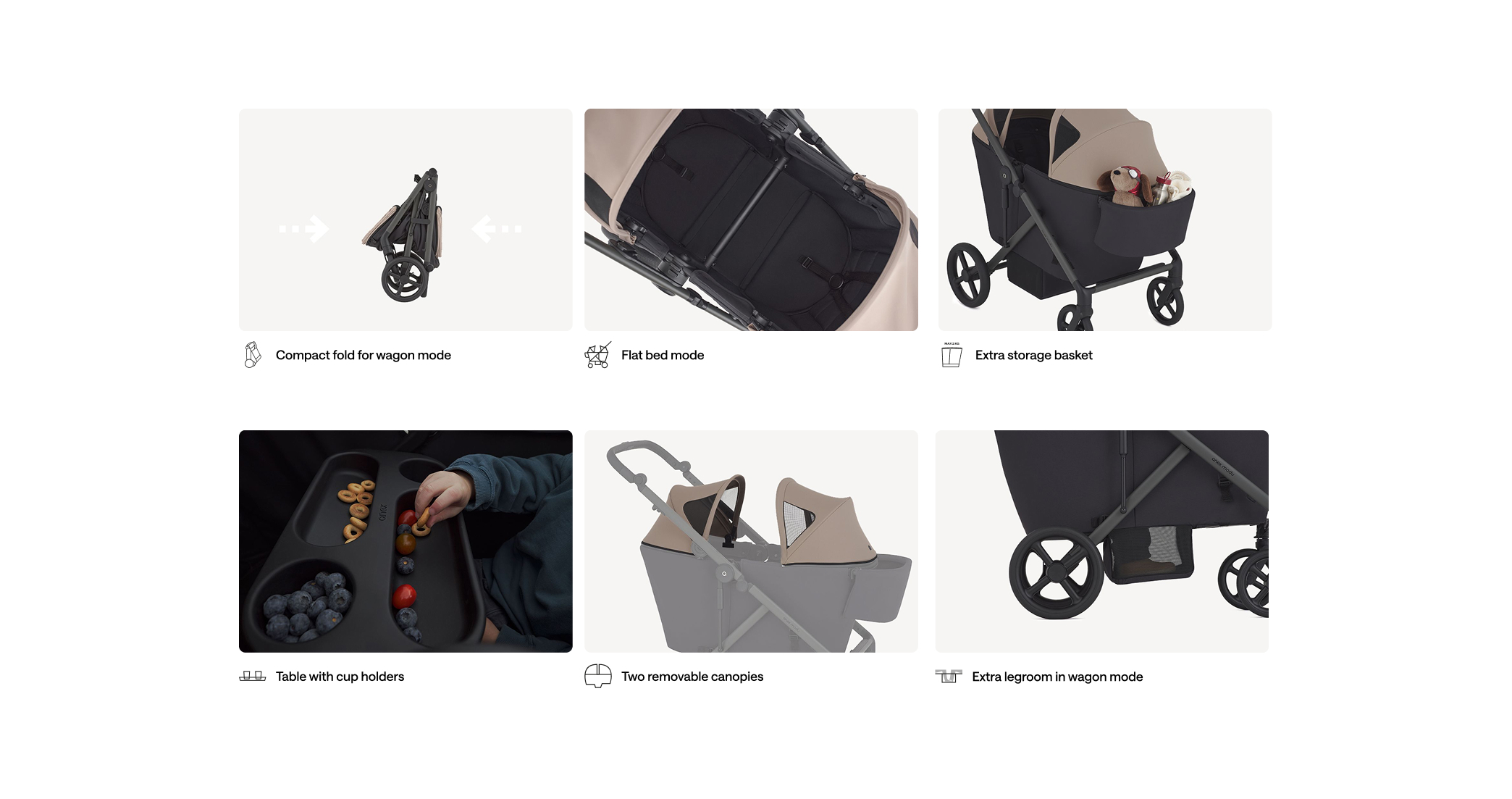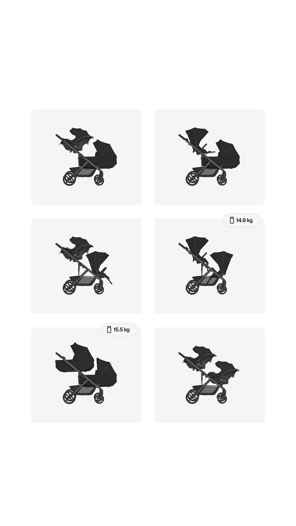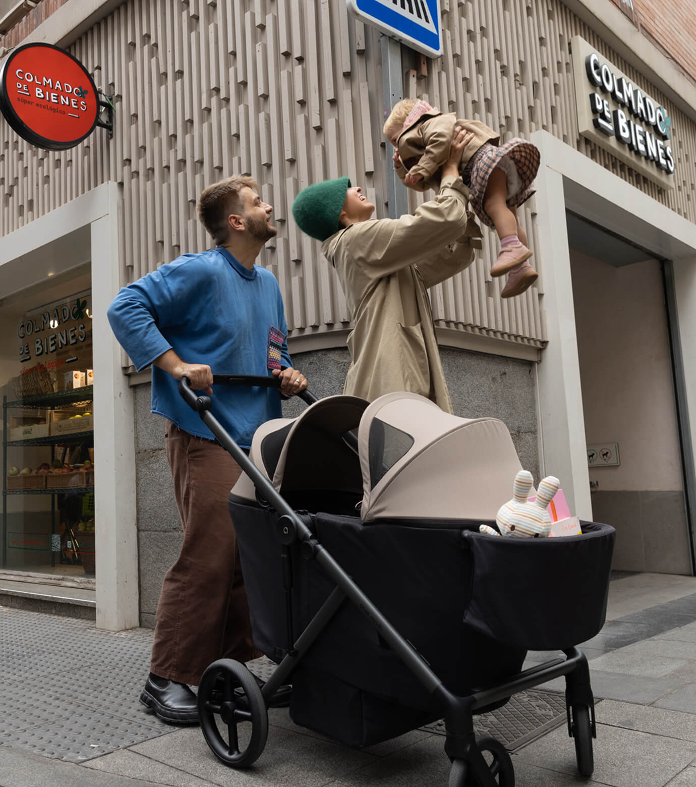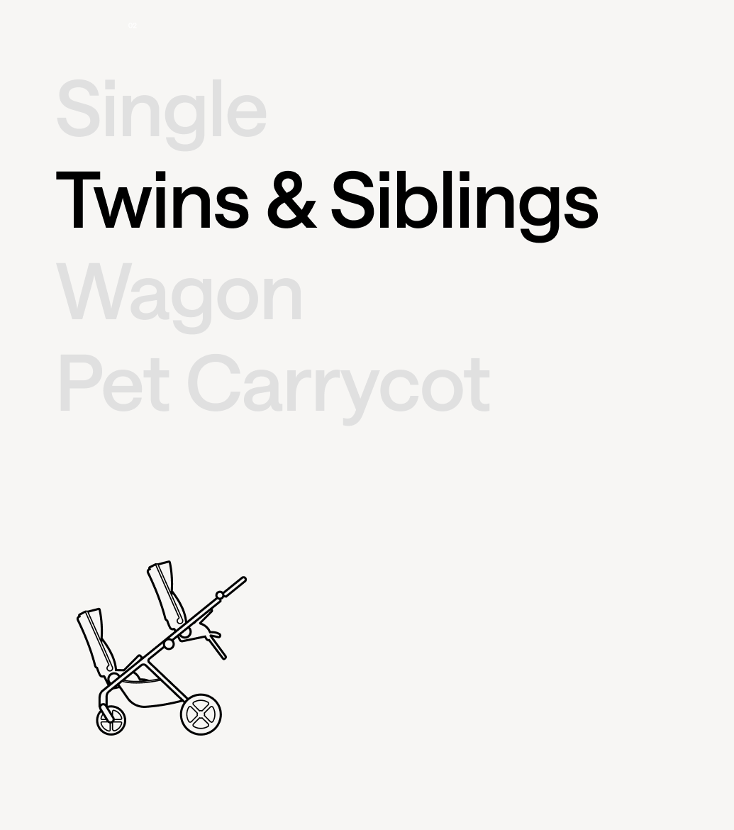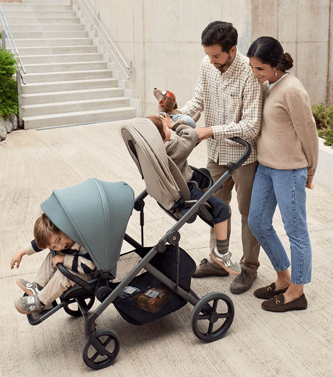 Various configurations can be freely mounted on the frame, including two carrycots for infants, a carrycot and a seat, two seats, or one of them combined with a pet carrier. In wagon mode, it can comfortably accommodate two children up to 4 years old.