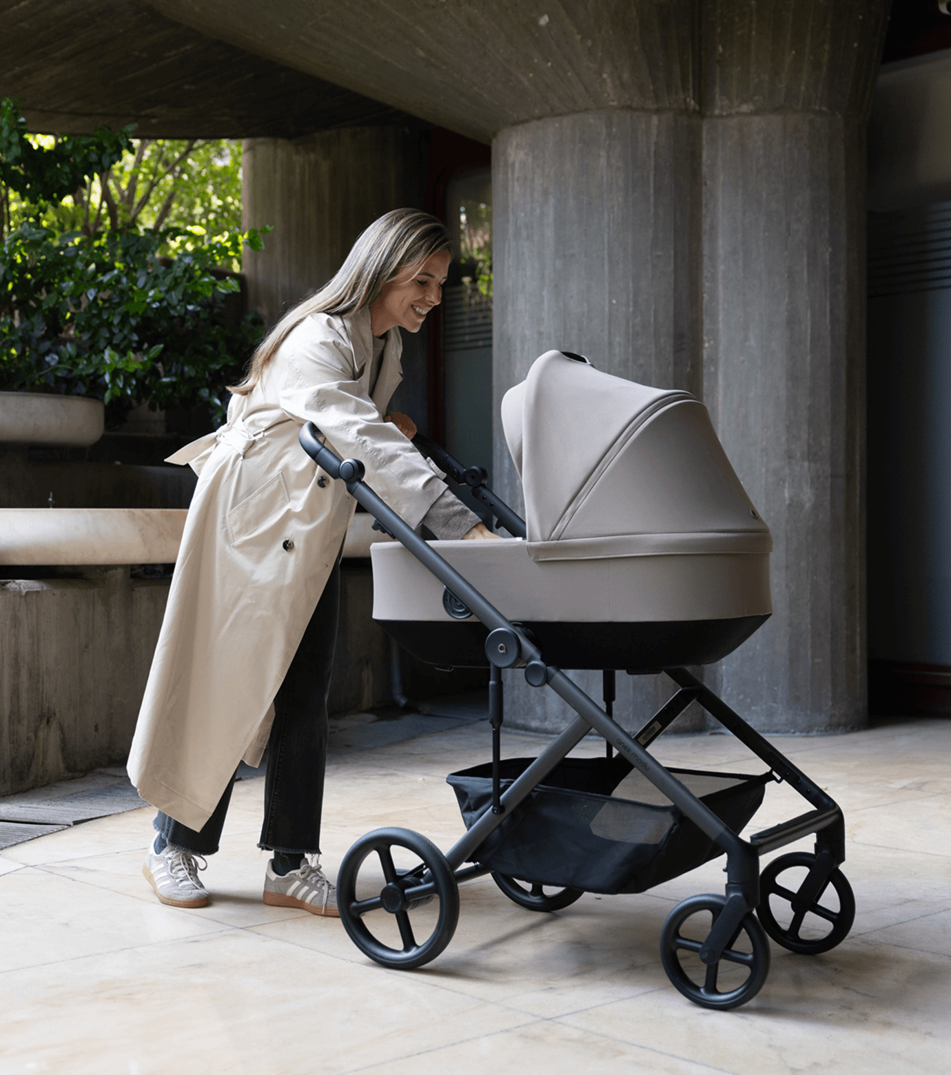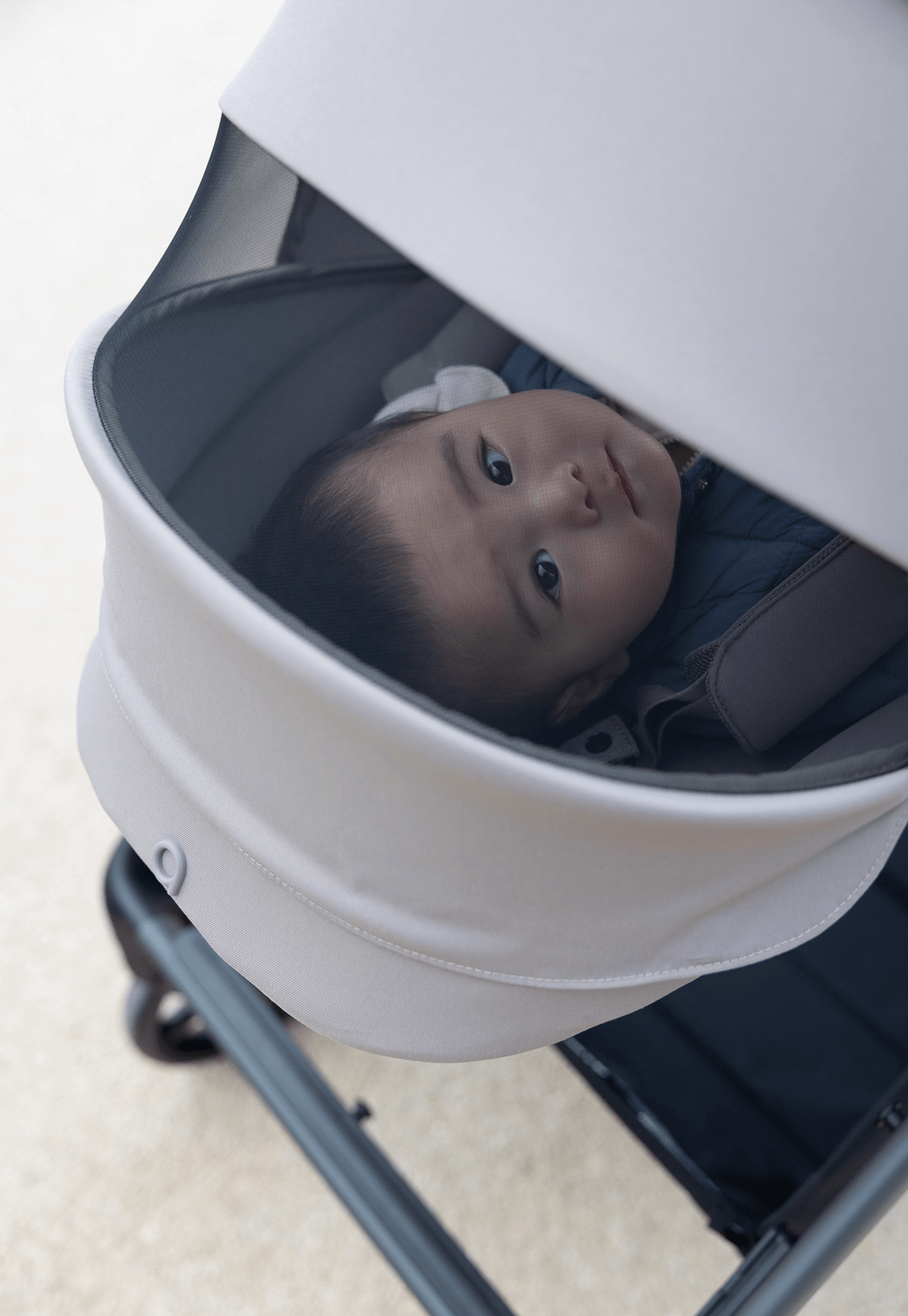 The carrycot features a sculpted lower form, improving visibility for a child traveling next to a younger sibling. The base of the carrycot is made from lightweight EPP material, reducing weight while enhancing acoustic comfort.